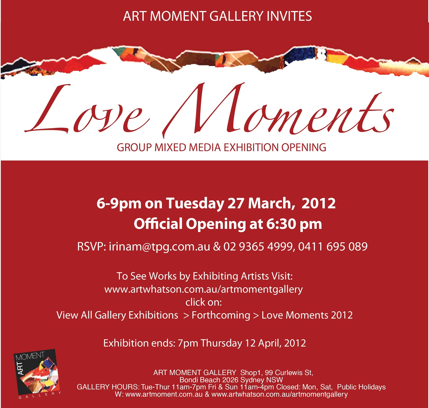 The exhibition opens 13th July 6:30 - 9:30p and runs through to July 15 . It will be held at ‘The Barn’ in Mosman located on Avenue Rd at the bottom of Mosman Bay, diagonally opposite the ferry terminal.