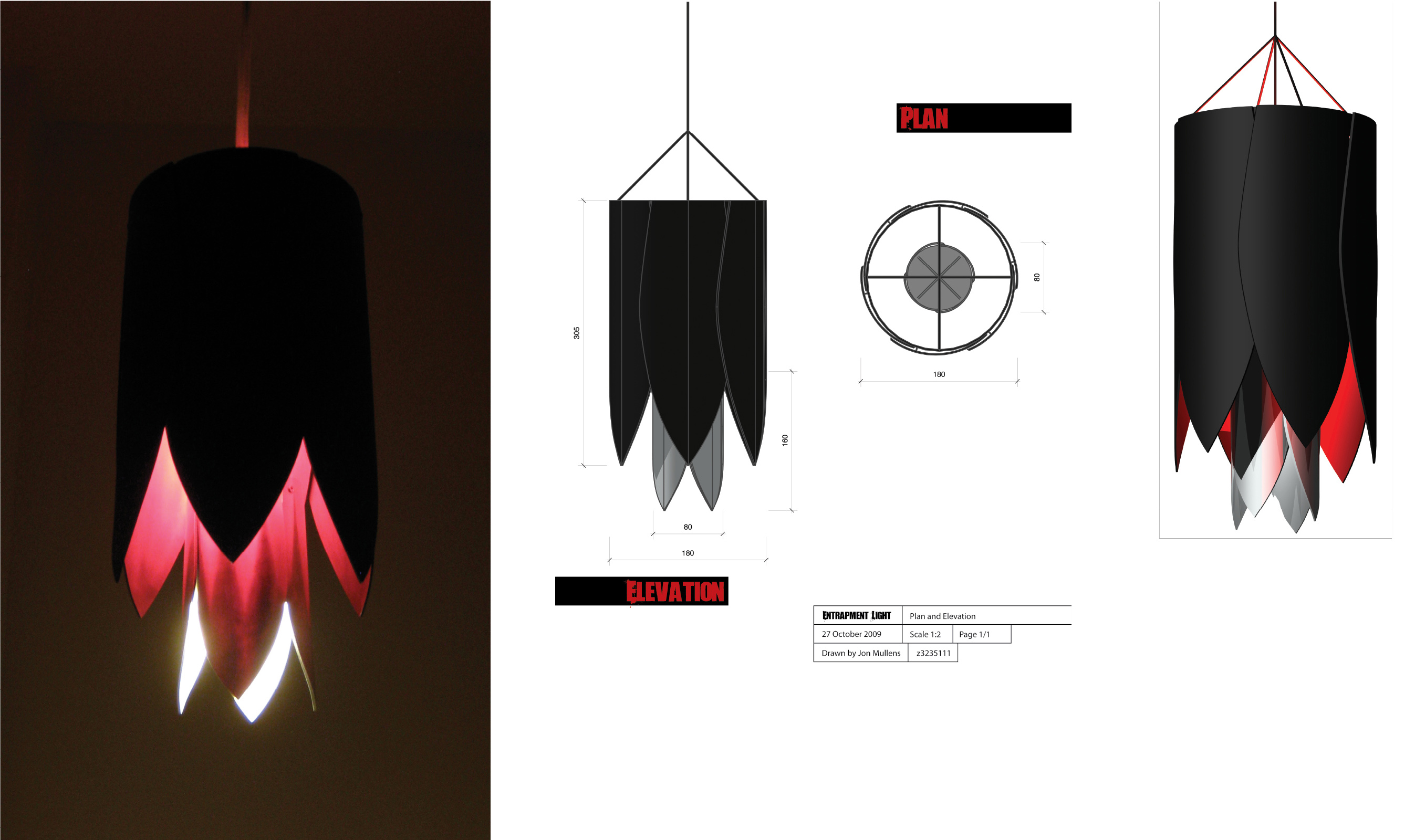 Deception, mimicry, sex and death are not what comes to mind when we think of flowers, however this is exactly what many of the orchid family use to pollinate and feed. Inspired by these unusual flowers the Entrapment Light has been designed for the Sydney Smart Light Festival, where several of these lights will be hung from the branches of the trees in Observatory Park. The lower white lights will lure curious visitors closer where motion sensors will activate the inner red lights. With the structure fully revealed, the viewer becomes trapped, for a moment at least. As they leave the light becomes dormant, waiting as it lures more prey, I mean people!